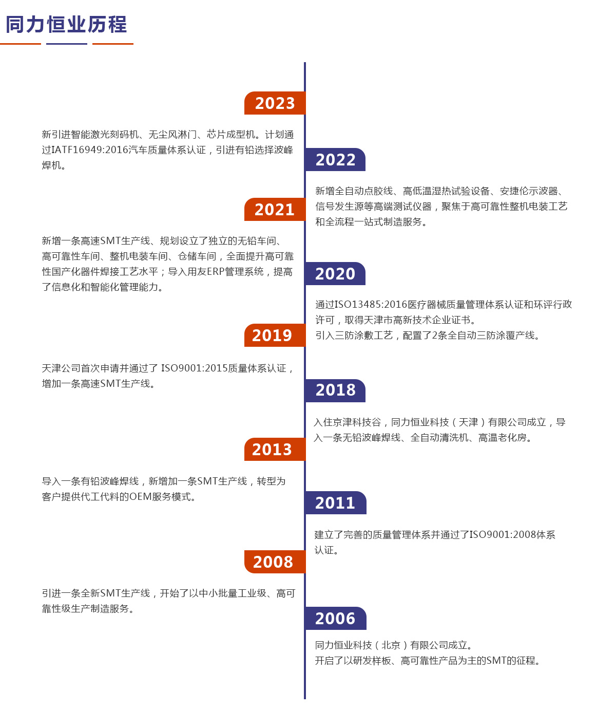 同力恒業(yè)科技成立于2006年,專業(yè)從事電子制造服務(EMS),專注于為客戶提供產(chǎn)品開發(fā)、工藝設(shè)計、物料配套、精密貼裝、插件焊接、三防涂敷、整機電裝、測試老化以及包裝運輸、售后維修等整個供應鏈解決方案。公司定位于高可靠性及中高端產(chǎn)品電子制造服務,在通訊導航、儀器儀表、醫(yī)療設(shè)備、汽車電子等領(lǐng)域具有豐富的一站式制造服務經(jīng)驗。